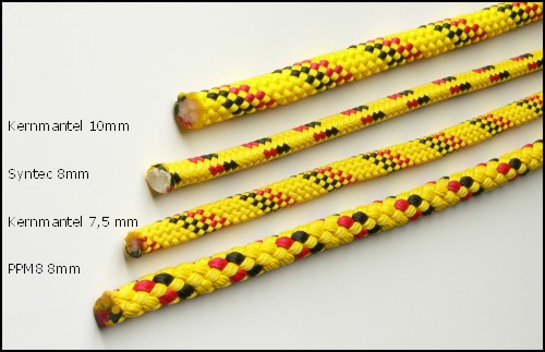 Das Syntec-Seil ist eine Kernmantel-Konstruktion. Der tragende Kern besteht aus extrem zugfestem Dyneema (PE-Superfiber), aussen herum der schützende Mantel aus Polypropylen (PP).